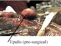 Epulides are firm masses involving the gingival tissue (gums). They are the most common benign oral tumors in dogs and are less common in cats. These tumors may be seen in dogs of any age but generally are found in those over 6 years old. The three histologic types of epulides are classified as fibromatous epulis, ossifying epulis, and acanthomatous epulis. The ossifying form is a fibromatous mass that has developed centers of ossification. They are generally single masses, although multiple masses may be present. The tumors are noninvasive, but may become quite extensive. They arise from the periodontal ligament of the subjacent tooth (the ligament that attaches the tooth to the bone), and complete surgical removal must include tissues up to and including the periodontal ligament. This often necessitates the removal of the affected tooth or teeth but complete excision is curative. What is the prognosis? Fibromatous and ossifying epulides (benign tumors) The prognosis for dogs with epulides is excellent following either surgery or radiation therapy treatment. Since these tumors are benign, they do not metastasize (spread) to other organs. For these tumors, the local tumor recurrence rate following surgical removal without removing the bone is 0-17% for dogs. Local recurrence is common in cats with multiple epulides and is reported in 73% of 11 cats 3 months to 8 years after surgical removal. Radiation therapy is rarely required for these tumors and simple surgical removal is usually sufficient. Acanthomatous epulides (benign but locally invasive) The treatments used for this type of tumor include surgery or radiation therapy. Because these tumors often invade the adjacent bone, the surgical removal of these tumors also includes bone removal. The radiation therapy seems to be less effective for tumors that are larger than 4cm in diameter and other complications associated with radiation therapy include bone decay observed in 6% of dogs and development of new tumors in the irradiated area in 5-18% of dogs. One study of 4 dogs showed that a chemotherapy drug called bleomycin administered directly into the tumor resulted in response in 4 dogs, but this study is too small to draw any general conclusions. Sources: